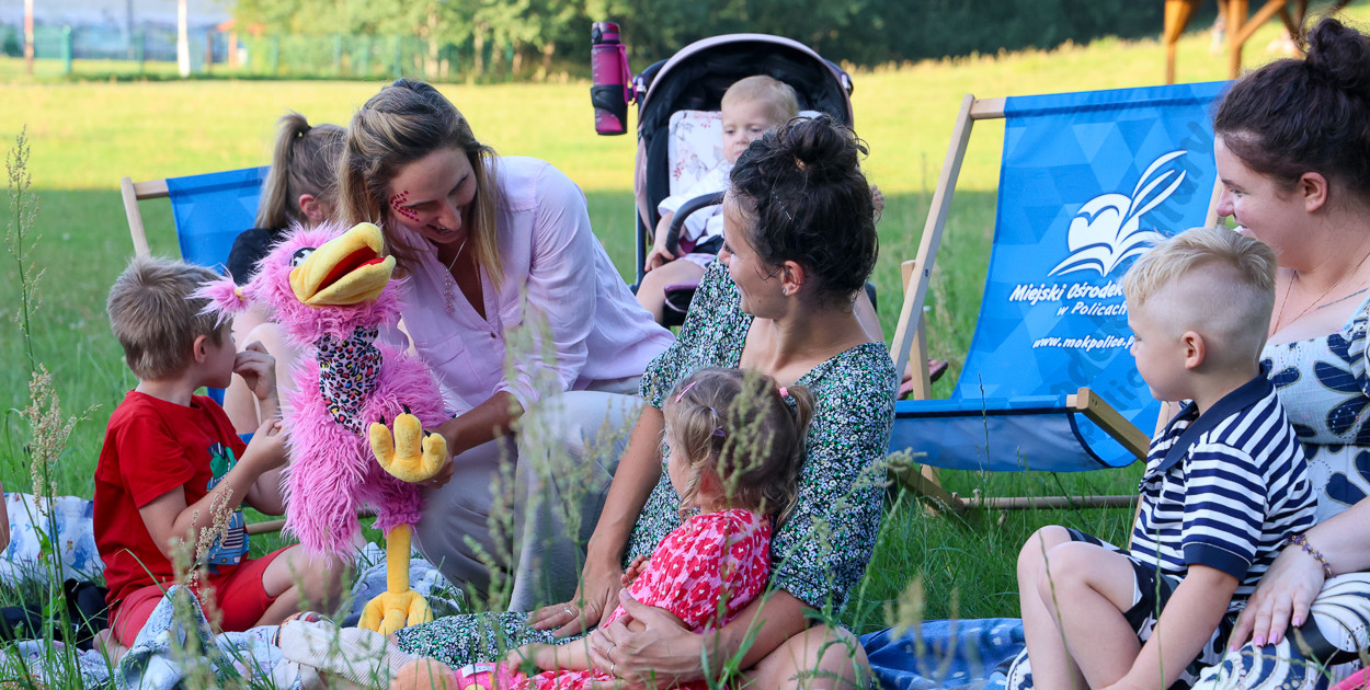 Spotkanie poprowadziły wspólnie pacynka Eugenia i Daria Zarzeczna – instruktorka, animatorka kultury, miłośniczka książek. Najmłodsi, siedząc wygodnie na leżakach, lub na trawie, tuląc ukochanego pluszaka, dali się porwać w bajkowy świat. Opowieść była również punktem wyjścia do warsztatów, podczas których dzieci, wspólnie z opiekunami, uruchomiły twórczą fantazję i wykazały się kreatywnością tworząc bajkowe magnesy.